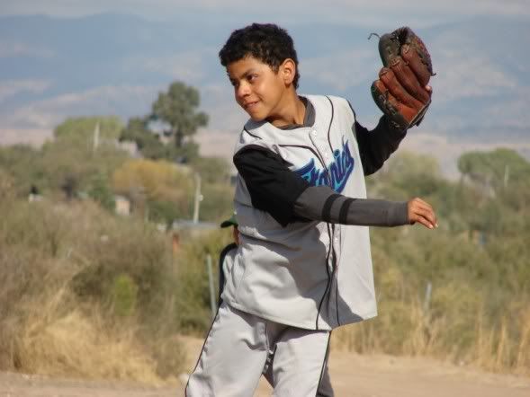 Before we went to dinner, I talked to Manuel again about the bibles and he said to pass them out in-between the boys’ baseball game and church. The baseball game was supposed to start at 9 and then church would start at 11. The game was also supposed to be on CdE grounds so there wouldn’t be an issue. Well, it’s 9:15 and the kids are getting on their bus. I asked if we could go on the bus, and they said yes, and so on we went. We went to a completely different part of Imuris, picked up the other team and some of the players on different spots on the road, and off we went. Jesus pitched the first 3 innings and he did awesome. Mario pitched the next 6 and he was really good too. They ended out winning 26-6. Wahoo! Yet, because they don’t have the 10 run rule like they do in little league here, the game lasted 3 hours because they did so well. By the time we got back to CdE, church was over. So, Manuel said to hand out the bibles at lunch time.